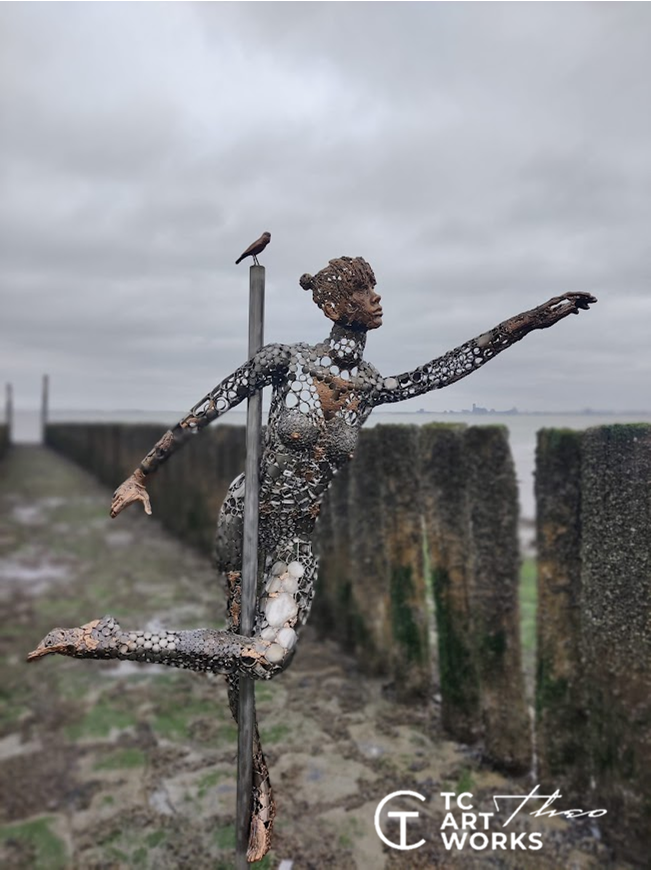 This work is a depiction of a pole dancer in motion. Mounted on a sturdy pedestal, the sculpture rotates with the wind, bringing to life the dynamics of pole dancing. The interaction with the wind makes the artwork different each time, depending on the circumstances, just as a real performance is unique each time.