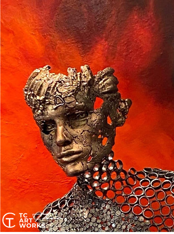 A sculpture of a woman looking at the world from behind a mask. Does she observe her surroundings without wanting to be recognized herself or … is she wearing the mask for protection?